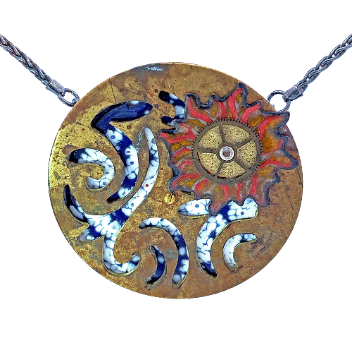 This handcrafted necklace is made of copper with enamel, brass, and sterling and hangs from a 19 ½ inch oxidized sterling silver wheat chain. Extra links at the clasp make the necklace adjustable up to 21 ½ inches. A large enamel galaxy is glimpsed through a hand-pierced brass disk topped with an enamel sun and watch gear. This is all connected to a sterling back plate using a tap and die method (a tiny screw and nut).