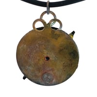 A handcrafted enamel and copper necklace that is based on the design of the astrolabe, an ancient astronomical instrument. It hangs from a 16 inch rubber cord which can be extended to 17 inches.