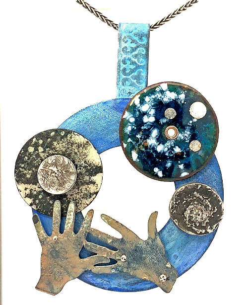 This hand-crafted necklace is all about space exploration. What outer or inner dimensions do you want to explore? Two hands, made of copper with patina, are reaching towards an enameled exoplanet, an enamel disk depicting distant stars and a silver galaxy. These pieces are set on a base of copper with patina. A 16 inch oxidized sterling silver wheat chain is included.