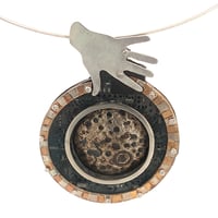 A one-of-a-kind necklace that celebrates the 1969 moon landing of Apollo 11. Handcrafted from sterling silver, chased and gold-plated copper and circuit board.